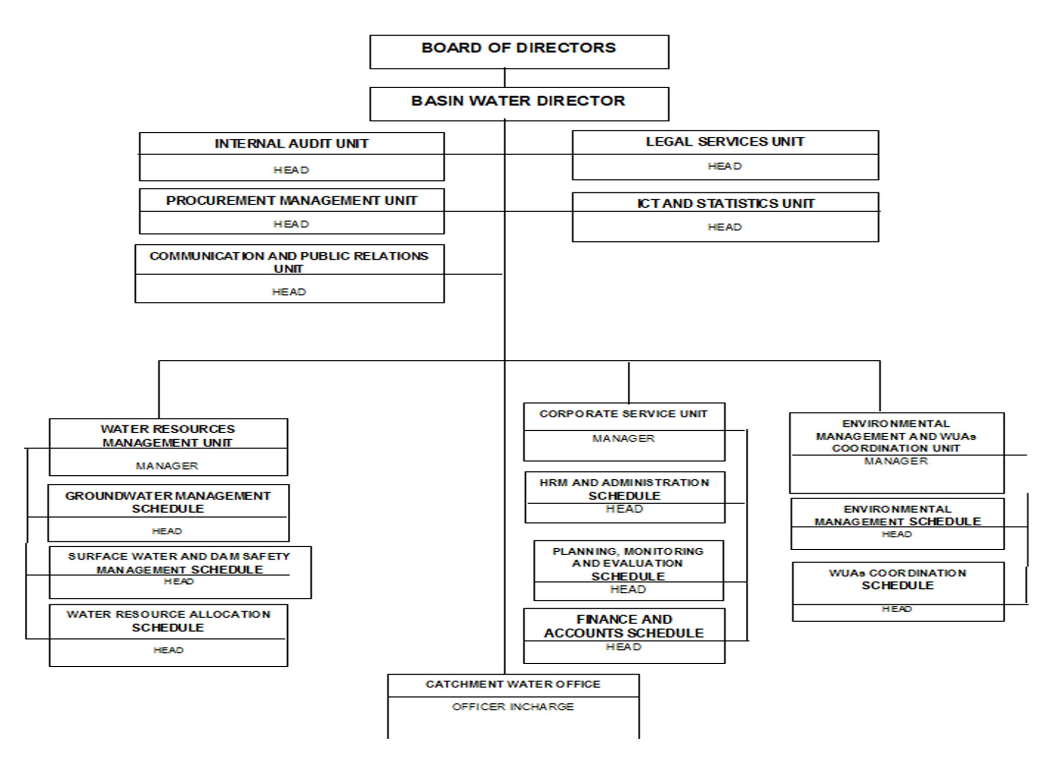 The Organization structure of Lake Rukwa Basin Water Board comprises of two core Units (Water Resource Management Unit, Environment & WUA Unit) and other nine supporting units